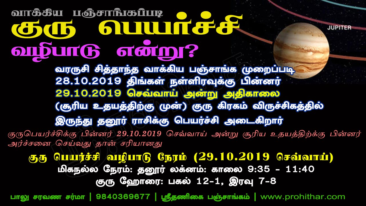 வாக்கியப்படி குரு பெயர்ச்சி வழிபாடு நேரம் 28.10.2019 & 29.10.2019 குரு பெயர்ச்சி பலன் என்பது புவிதற்சுழற் இராசி(லக்னம்), சூரியன் நின்ற இராசி, சந்திரன் நின்ற இராசி, நடப்பு தசைபுக்தி அடிப்படையில்தான் அமையும். சந்திர ராசிக்கு அஷ்டமத்தில் குரு நின்றாலும் லக்னம், சூரியன், தசாபுக்தி அடிப்படையில் மிக நல்ல பார்வை இருப்பின் வெறும் "10% மட்டுமே குரு கெடுக்கும்" 90% நண்மை கிட்டும். எனவே பத்திரிக்கைகளில் வரும் இராசிபலன் என்பது பொதுவானது இதை வைத்து பயப்படவேண்டாம்.