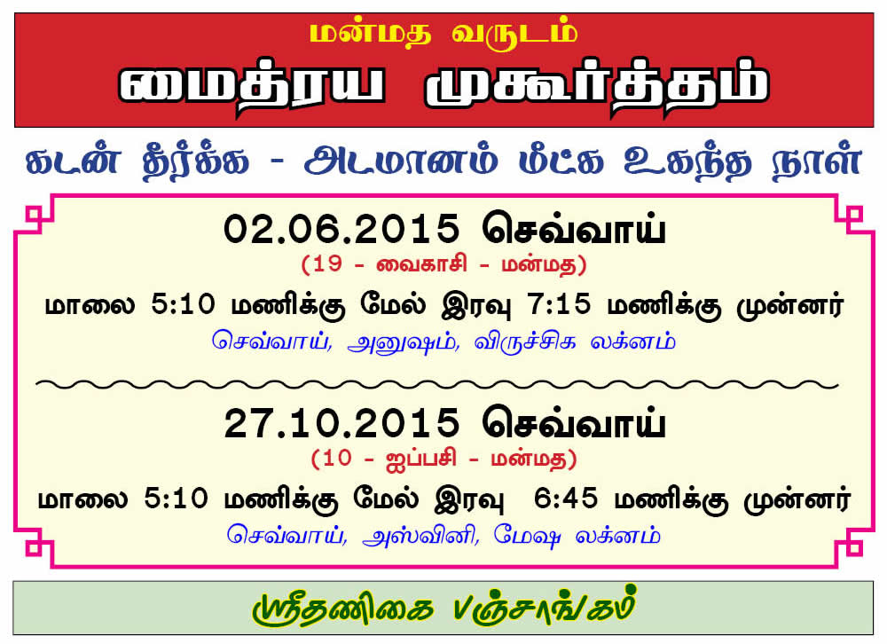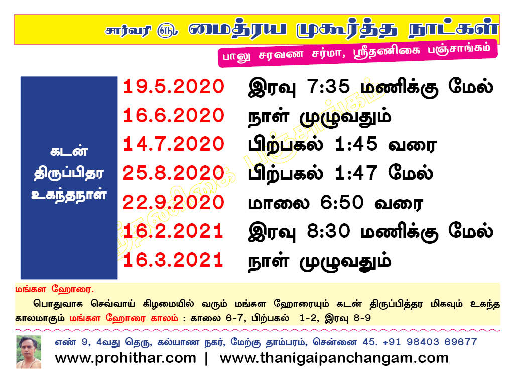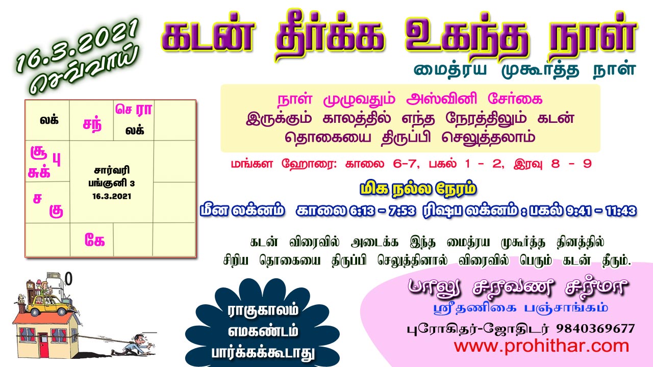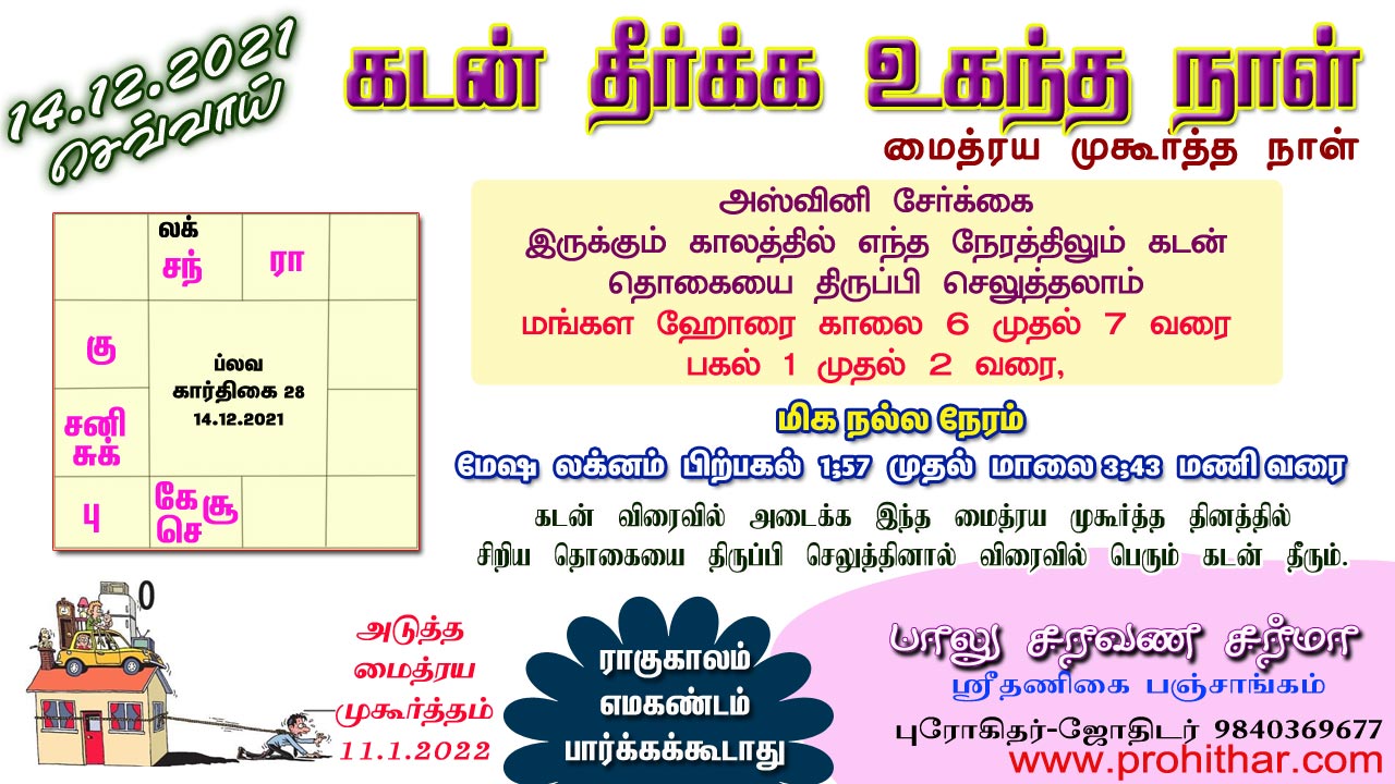 மைத்ரய முகூர்த்தம் 14.12.2021 செவ்வாய ் மைத்ரய முகூர்த்தம் - கடன் தீர்க்க உகந்த நாள் 22-9-2020 செவ்வாய் மைத்ரய முகூர்த்தம், பௌமஸ்வனி யோகம் சார்வரி வருஷ மைத்ரய முகூர்த் நாட்கள் செவ்வாய் கிழமை அன்று செவ்வாய் ஹோரை காலை 6 - 7 அல்லது மதியம் 1 - 2 இருக்கும் காலத்தில் மைத்ரேய முகூர்த்தம் வருமேயானால் மிகவும் விசேஷமானது. மாதம் தோறும் அஸ்வினி, அனுஷம் வருகை தந்தாலும், செவ்வாய் கிழமையுடன் சேர்ந்து பகல் வேளையில் மைத்ரேய முகூர்த்தம் வருடத்திற்கு சிலநாட்களே வரும். மாலையில் சூரிய அஸ்தமனத்திற்கு பின்னர் பணம் கடன் கொடுத்தல்-வாங்கல் கூடாது என்பதால் மாலை சூரிய அஸ்தமனத்திற்கு பின்னர் ஒரு நாழிகை வரை சூரிய வெளிச்சம் இருக்கும் காலத்திற்கு முன்னர் மைத்ரேய முகூர்த்தம் வரின் நன்று மைத்ரேய முகூர்த்த வேளையில் சிறிய அளவிற்காவது வங்கி கடன்(Bank Loan), நகை கடன் (Jewellery loan), வீட்டு அடமானம் (Housing mortgage loan), கடன் அட்டை(Credit card loan) கடனை திருப்பி தந்தால் வெகுவிரைவில் பெருங்கடன் தொகை அடைக்கப்பட்டு நிம்மதி கிட்டும். மாற்று தினங்கள் 1.மேத்ரய முகூர்த்த நாளில் இயலாத சூழலில் செவ்வாய் கிழமையுடன் அஸ்வினி அல்லது அனுஷம் நட்சத்திரம் சேரும் நாளில் லக்னம் நள்ளிரவு வந்தாலும் அன்று கடனை அடைத்தல் நன்று. 2.அஸ்வினி நட்சத்திரம் உள்ள நாளில் மேஷ லக்னத்திலும், அனுஷம் நட்சத்திரம் உள்ள நாளில் விருச்சிக லக்னத்திலும் கடன் அடைக்கலாம். மாதத்திற்கு இரண்டு அல்லது மூன்று முறை இதுபோன்று வரும் (இது முழுமையான மைத்ரய முகூர்த்தம் அல்ல சுமார் 66% மைத்ரய முகூர்த்தமாகும்) 3.பிறந்த திதி, வாரம், நட்சத்திரம் ஆகியவற்றில் கடனை திரும்பி தருவது நன்று.