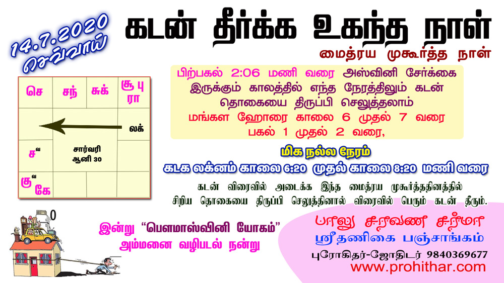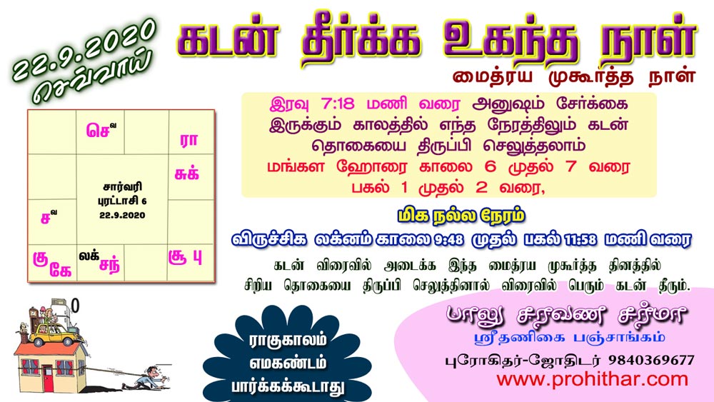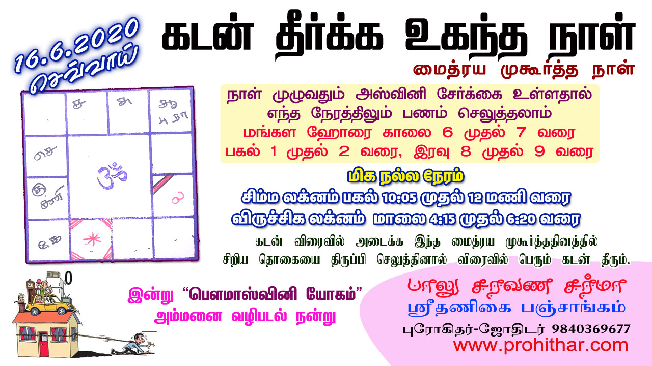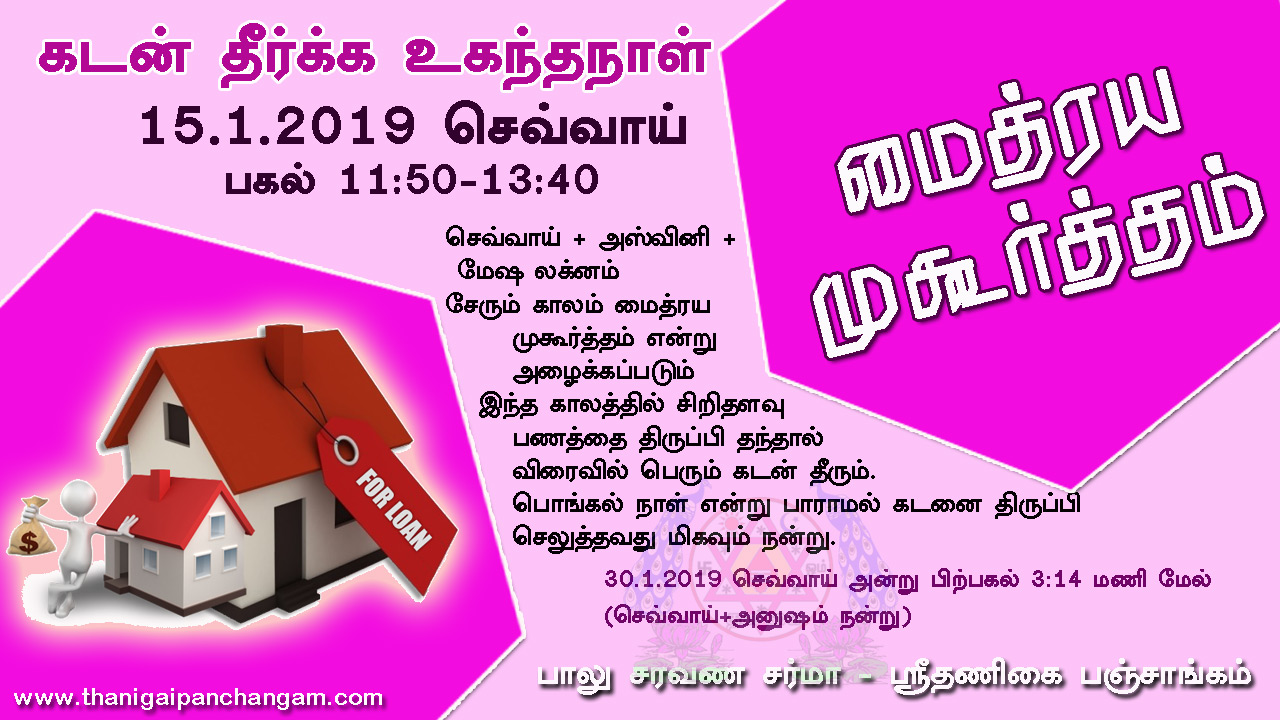 மைத்ரய முகூர்த்தம் 14.12.2021 செவ்வாய ் மைத்ரய முகூர்த்தம் - கடன் தீர்க்க உகந்த நாள் 22-9-2020 செவ்வாய் மைத்ரய முகூர்த்தம், பௌமஸ்வனி யோகம் சார்வரி வருஷ மைத்ரய முகூர்த் நாட்கள் செவ்வாய் கிழமை அன்று செவ்வாய் ஹோரை காலை 6 - 7 அல்லது மதியம் 1 - 2 இருக்கும் காலத்தில் மைத்ரேய முகூர்த்தம் வருமேயானால் மிகவும் விசேஷமானது. மாதம் தோறும் அஸ்வினி, அனுஷம் வருகை தந்தாலும், செவ்வாய் கிழமையுடன் சேர்ந்து பகல் வேளையில் மைத்ரேய முகூர்த்தம் வருடத்திற்கு சிலநாட்களே வரும். மாலையில் சூரிய அஸ்தமனத்திற்கு பின்னர் பணம் கடன் கொடுத்தல்-வாங்கல் கூடாது என்பதால் மாலை சூரிய அஸ்தமனத்திற்கு பின்னர் ஒரு நாழிகை வரை சூரிய வெளிச்சம் இருக்கும் காலத்திற்கு முன்னர் மைத்ரேய முகூர்த்தம் வரின் நன்று மைத்ரேய முகூர்த்த வேளையில் சிறிய அளவிற்காவது வங்கி கடன்(Bank Loan), நகை கடன் (Jewellery loan), வீட்டு அடமானம் (Housing mortgage loan), கடன் அட்டை(Credit card loan) கடனை திருப்பி தந்தால் வெகுவிரைவில் பெருங்கடன் தொகை அடைக்கப்பட்டு நிம்மதி கிட்டும். மாற்று தினங்கள் 1.மேத்ரய முகூர்த்த நாளில் இயலாத சூழலில் செவ்வாய் கிழமையுடன் அஸ்வினி அல்லது அனுஷம் நட்சத்திரம் சேரும் நாளில் லக்னம் நள்ளிரவு வந்தாலும் அன்று கடனை அடைத்தல் நன்று. 2.அஸ்வினி நட்சத்திரம் உள்ள நாளில் மேஷ லக்னத்திலும், அனுஷம் நட்சத்திரம் உள்ள நாளில் விருச்சிக லக்னத்திலும் கடன் அடைக்கலாம். மாதத்திற்கு இரண்டு அல்லது மூன்று முறை இதுபோன்று வரும் (இது முழுமையான மைத்ரய முகூர்த்தம் அல்ல சுமார் 66% மைத்ரய முகூர்த்தமாகும்) 3.பிறந்த திதி, வாரம், நட்சத்திரம் ஆகியவற்றில் கடனை திரும்பி தருவது நன்று.
